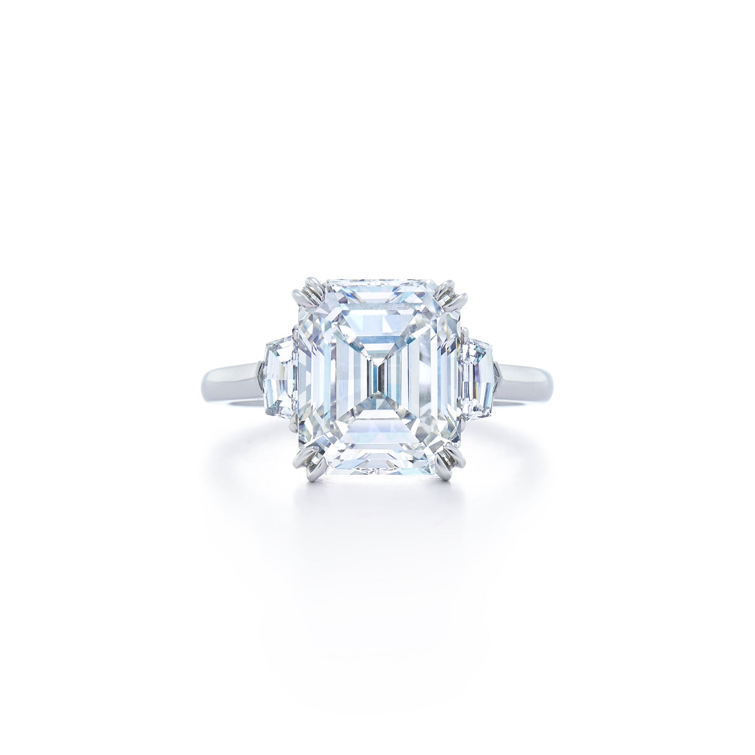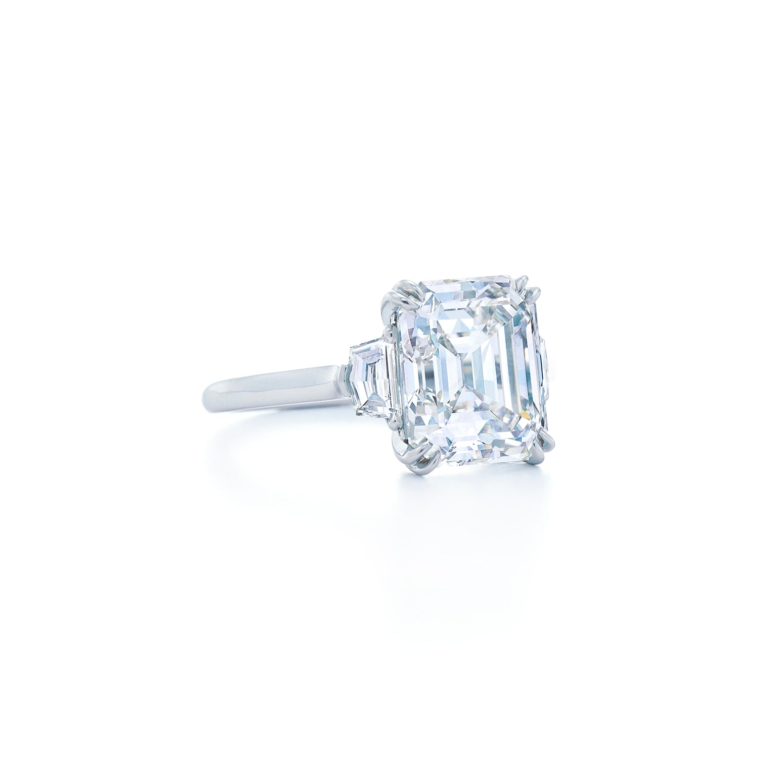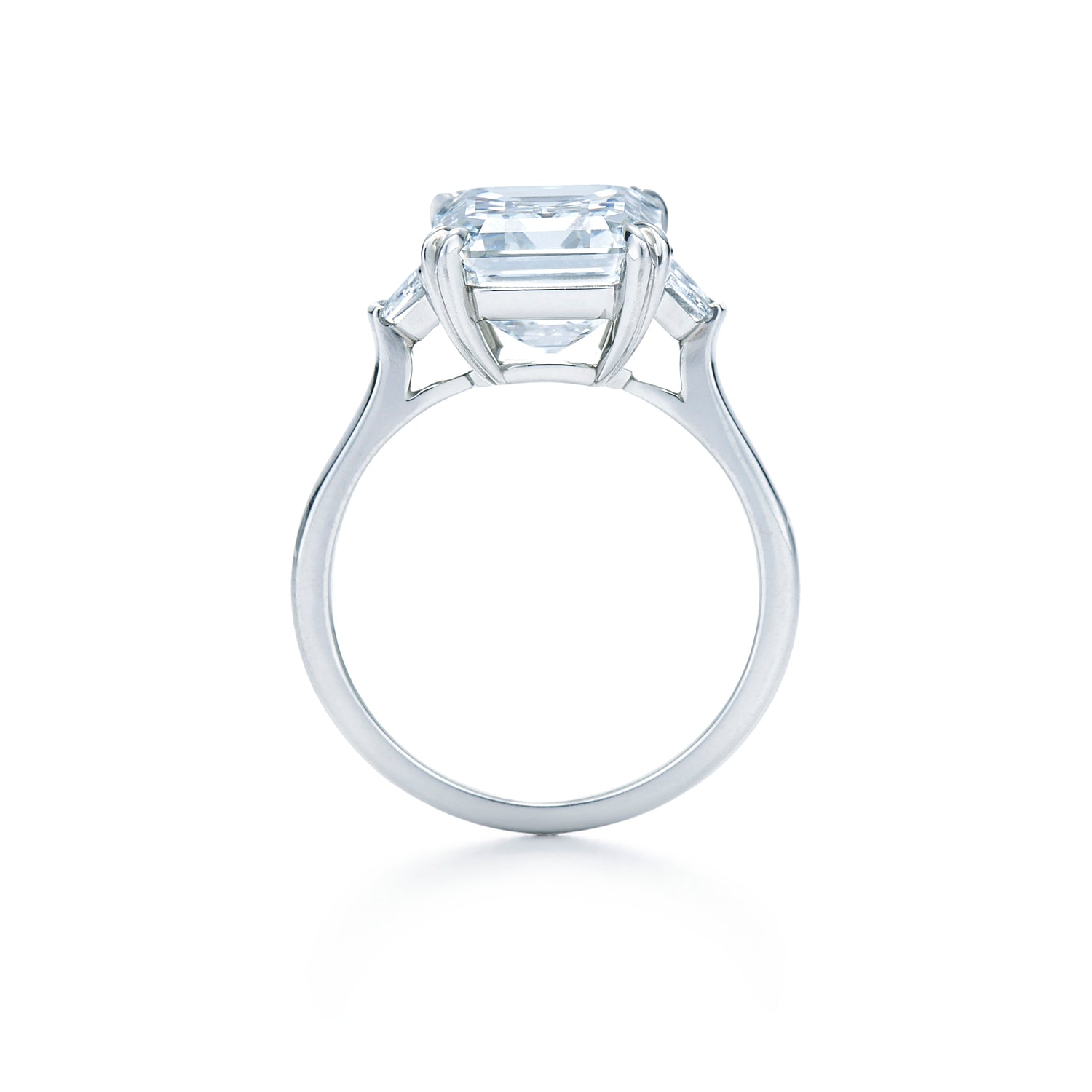Emerald cut diamond ring with cadi side stones. Set in platinum.
