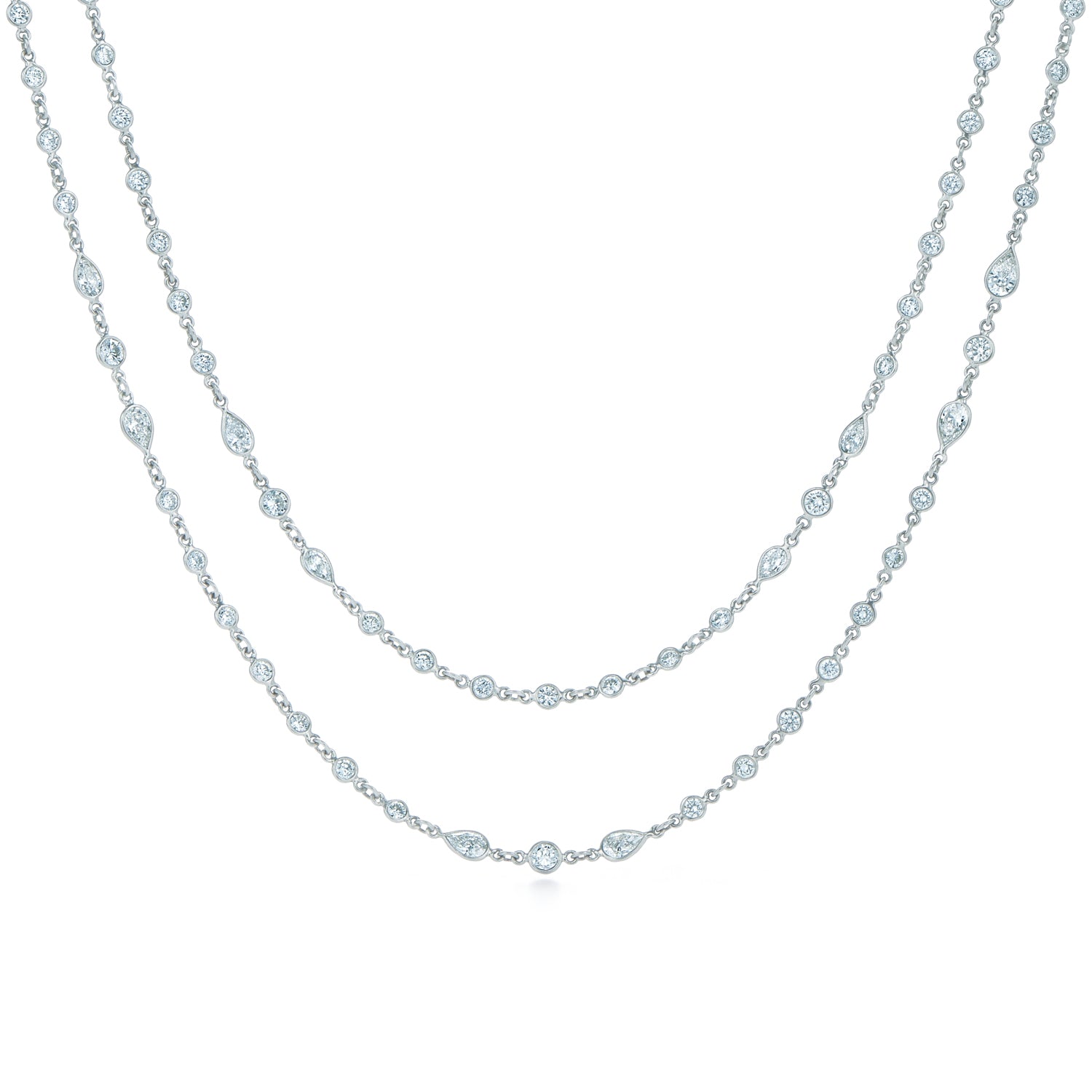 Brilliant cut round and pear shape diamond necklace in platinum.