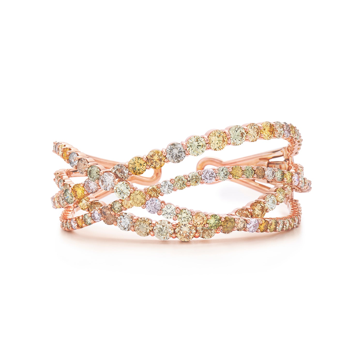 Natural fancy color diamond cuff in 18k rose gold.