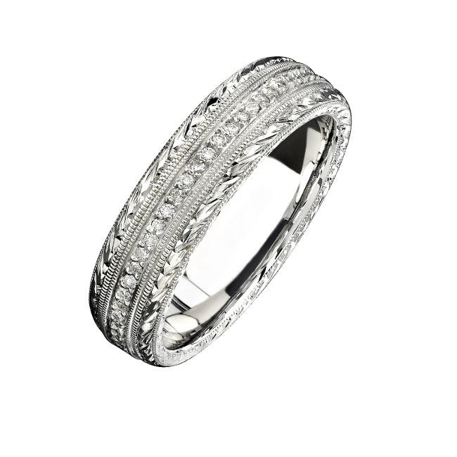 A single row of brilliant round white, pave set diamonds totaling 0.32 ctw. sits at the center of masterful hand engraving in this 14k white gold men's wedding band.