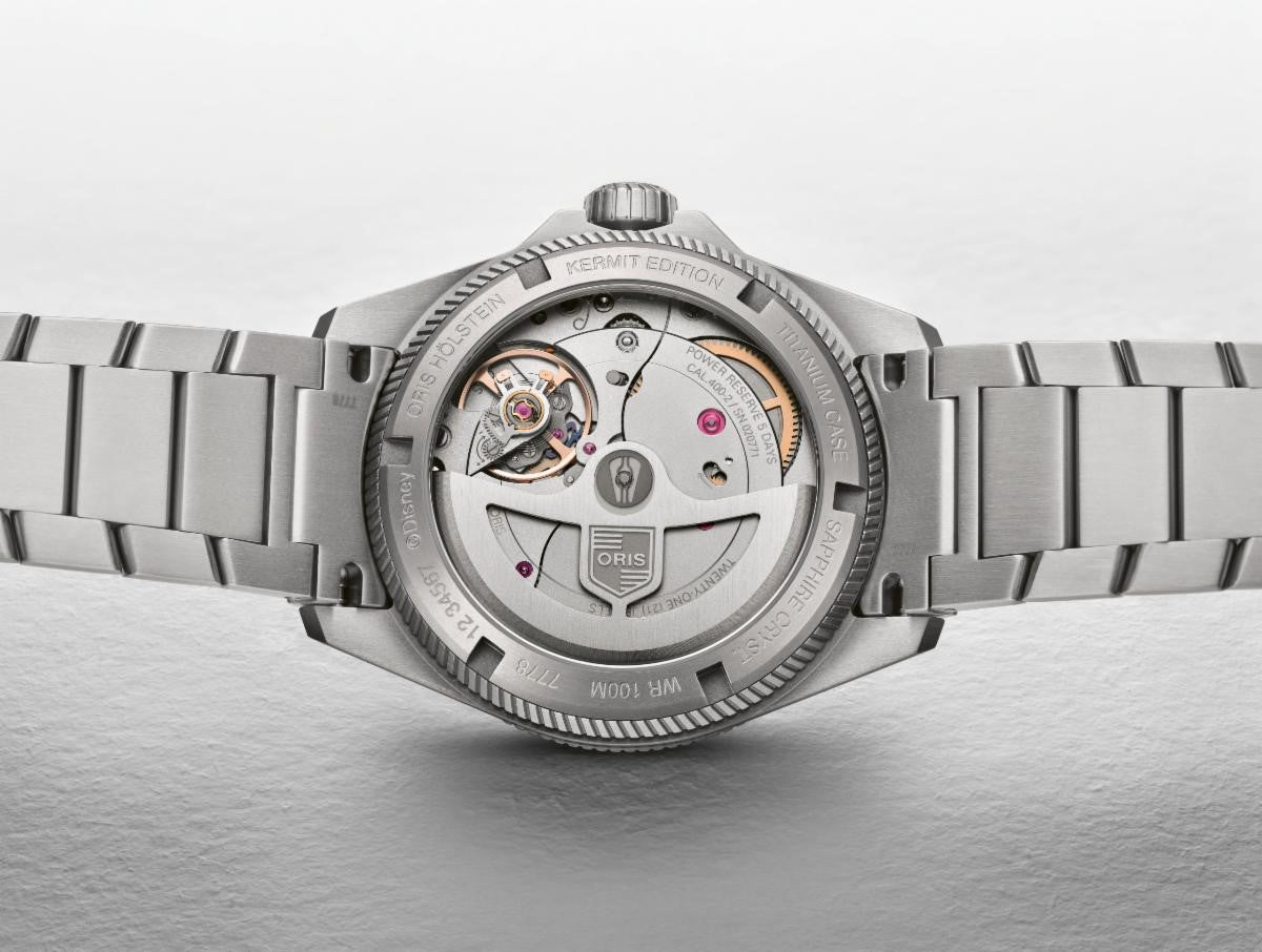 KERMIT APPEARS ON KERMIT DAY THE FIRST OF THE MONTH. LIKE THE GREEN DIAL, THE IDEA OF THIS GENTLE, HUMOROUS TOUCH IS TO ENCOURAGE US NOT TO TAKE LIFE TOO SERIOUSLY. TO LOOK UP, SMILE AND DO SOMETHING WE ENJOY, SOMETHING FUN. THAT MIGHT TAKE FIVE MINUTES. A MOMENT OF QUIET REFLECTION FOR SOME. FOR OTHERS, A CUP OF COFFEE, A PHONE CALL, A BATH, A SHORT WALK. FIND THE JOY. FITTED THE WITH THE ORIS CALIBRE 400, THE INNOVATIVE IN-HOUSE AUTOMATIC THAT TOOK SIX YEARS TO DEVELOP. THE MOVEMENT MAKES THREE KEY PERFORMANCE PROMISES: ANTI MAGNETIC, FIVE DAY POWER RESERVE AND A 10 YEAR WARRANTY.