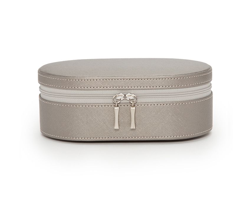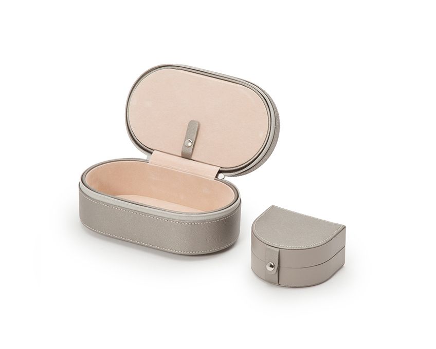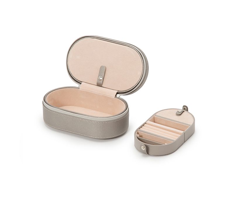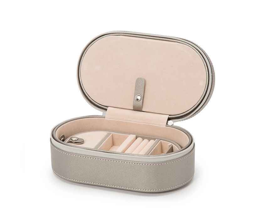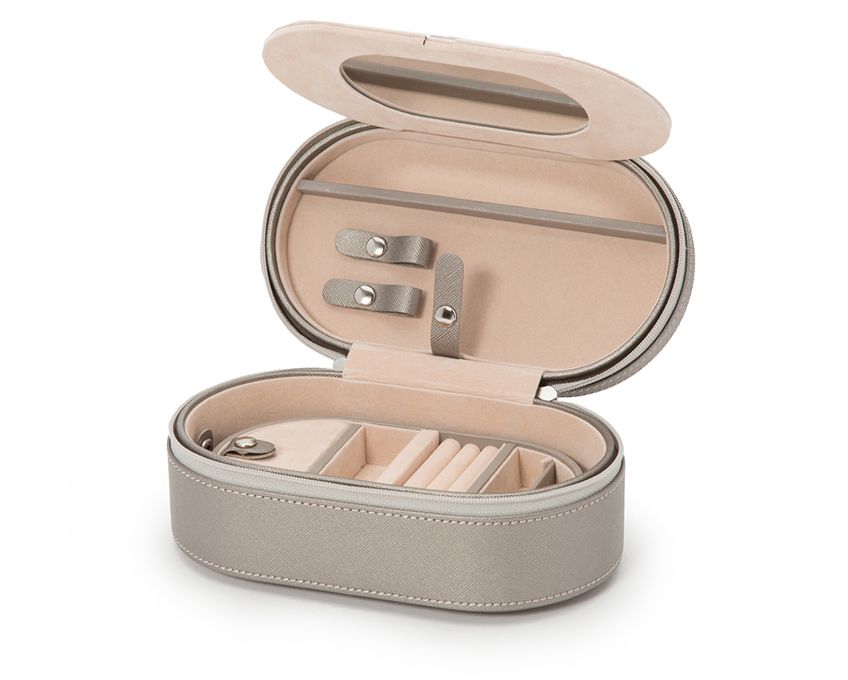 Heritage jewelry case, a classic style combined with functional design. Includes zip closure, 2 jewelry compartments, 2 necklace holders, travel case (4 compartments, 2 ring rolls and 6 earring holes), glass mirror, chrome finished hardware, vegan leather and ultra-suede lining.